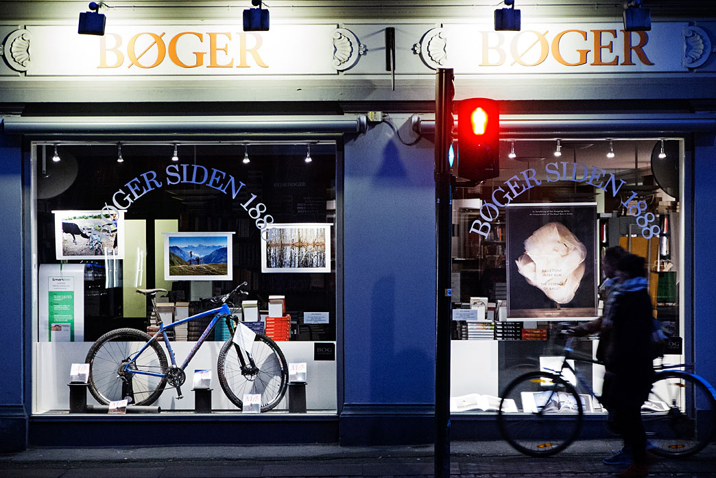 I forbindelse med udgivelsen af min bog Mtb – Mountainbike for novicer og nørder, havde jeg lovet min lokale boghandel Kleins en beskidt cykel til vinduet. Mine egne har ikke tid til den slags, så jeg spurgte Thomas fra Team Bertelsen om de kunne undvære en af deres democykler, og vi blev enige om at den rosa Superlight jeg tidligere har prøvet, ville egne sig til opgaven. Da jeg fik cyklen viste det sig at være en ny cobolt-blå HighBall med orange logo ..  Thomas mente farven egnede sig bedre som blikfang.