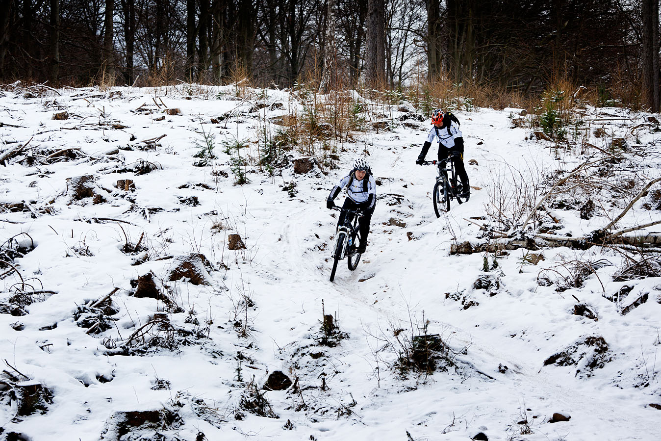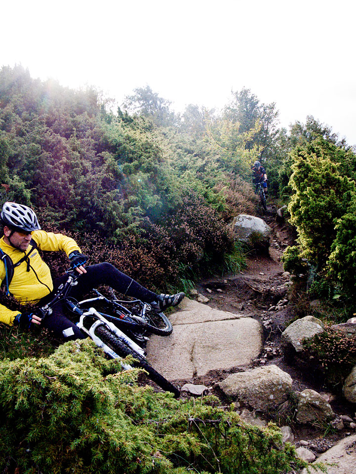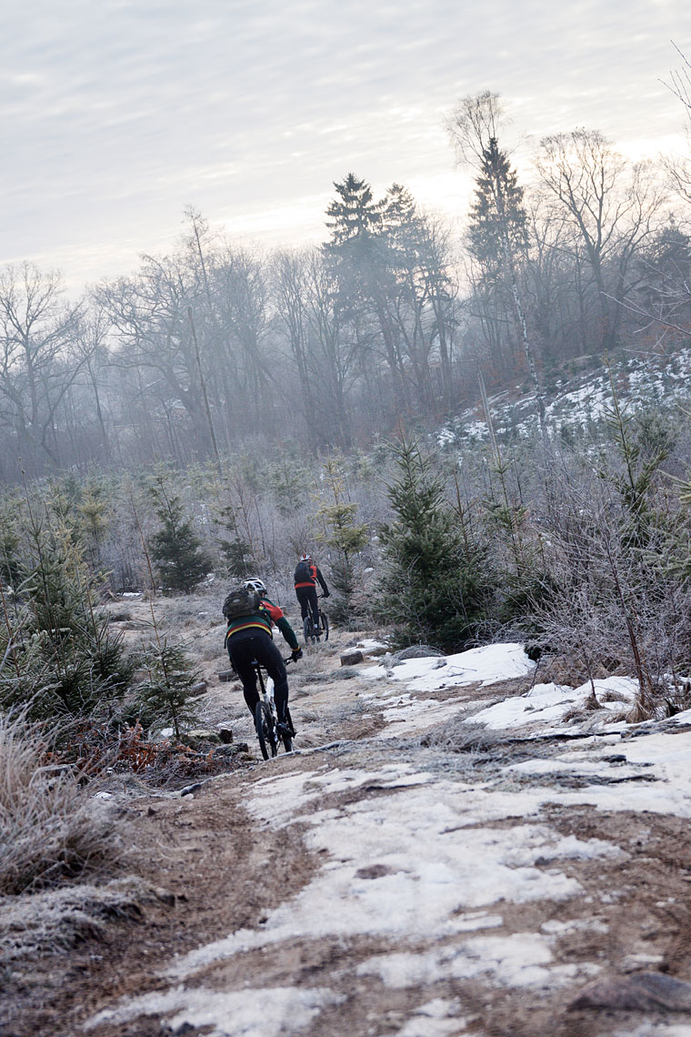 Jeg har altid min Canon G10 med i kamelryggen og efter jeg har fået en WingNut, har jeg ofte også et Canon 500D med, det fysisk mindste Canon spejlreflex kamera med den lille APS-C chip. Det giver langt mere kontrol at fotografere med et spejlreflex-kamera men til gengæld kræver det også mere tid når man skal have rygsækken af, kameraet frem osv. Rent teknisk er det også bedre, specielt i dårligt lys og med lange brænvidder. Men min professionelle stolthed sagde mig at jeg burde rykke endnu et skridt og tage billedet med et fullframe kamera, hvilket jo gør at udstyret vokser, både i størrelse og i vægt ! Seb Rogers er en engelsk mountainbike-fotograf som ikke laver andet (!), altså udover også at blogge om sine problemer i forbindelse med det. Efter 42 blogindlæg er jeg klar over der ikke findes et endeligt svar på problemet med hvor meget udstyr man skal medbringe. Så det endte med fullframe, en Canon 5D mk II med 70-200 mm f4’eren og en 28 mm f1.8 ved siden af .. og G10’eren.