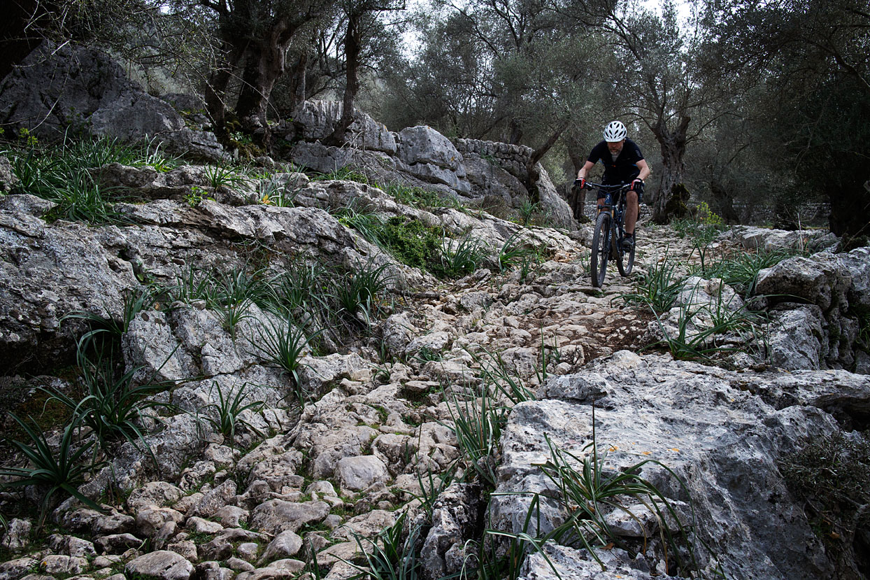 Toni, flink fyr med store lår og WorldCup striber på den stramme team-lycra, ankom på sin 29er carbonraket næste morgen. Nok mere triatlet end mountainbiker, skulle det vise sig. Fede trails op, pilgrimsvandreruten, kombineret med lidt for meget landevej, gennem klosteret i Lluc og så gik det nedad. En hullet grusvej som snævrede ind til et rigtigt trail, en stejlt vandresti med trin og drops. Ved det første rigtig svære stykke stod Toni af cyklen! Velvidende det er det tætteste man kommer på at begå hybris, kørte jeg udenom ham og fortsatte nedad, efterfulgt af de andre .. og Toni. Arghhh lød der bag mig lige da jeg nåede bunden .. Toni havde lavet en halv grønlændervending, forlæns!