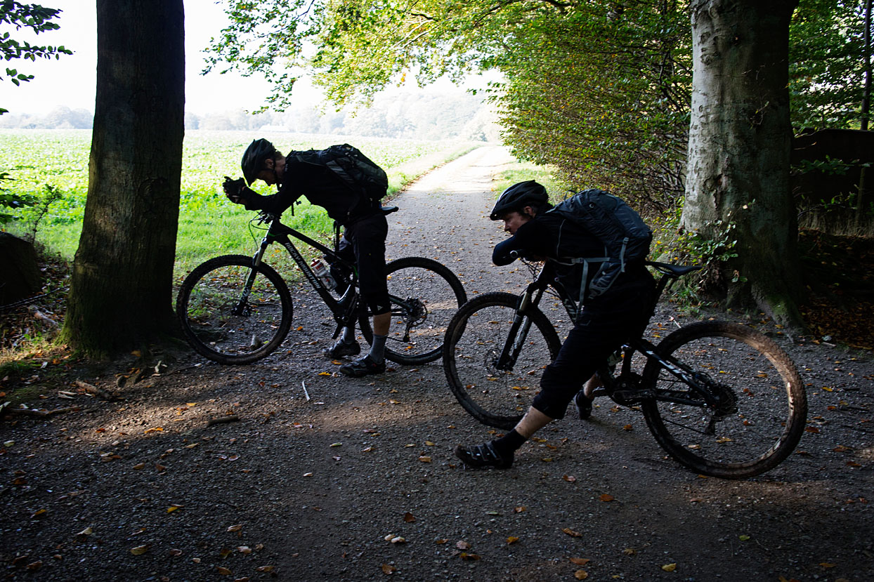 Det var muddersæsonens første tur på Dad med bæver-dæk, og ved det første lille hop røg min ene fod ud af pedalen, så jeg landede lidt hårdt på sadlen på den stive vintercykel. Sadlen sad derefter i en vinkel som ville umuliggøre al fremtidig reproduktion, og selvom det er OK, besluttede jeg alligevel at stoppe og justere den. Helt godt blev det ikke, men det gør det sjældent med den slags justeringer i skoven.