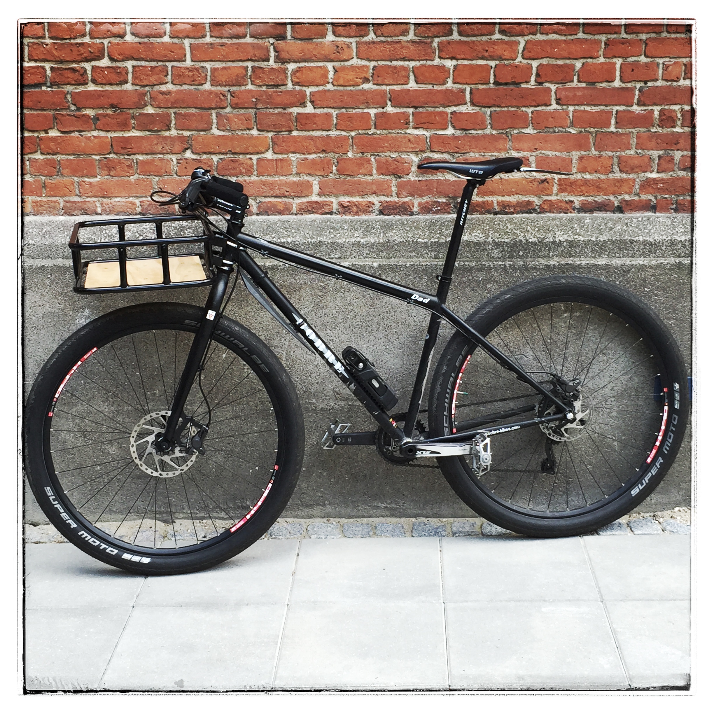 Jeg havde set en total checket engelsk urban-cykel på Instagram med en kurv/lad, så jeg gik på jagt. Den helt rigtige kurv med brædder i bunden koster selvfølgelig en tusse og skal specialimporteres fra NY, men heldigvis opdagede jeg at min nye lokale Venus cykelpusher havde en næsten tilsvarende hængende til en tredjedel. Og med en montering som med lidt modification, et stort 2,5″ rør-spændebånd, kan bruges på en MTB.