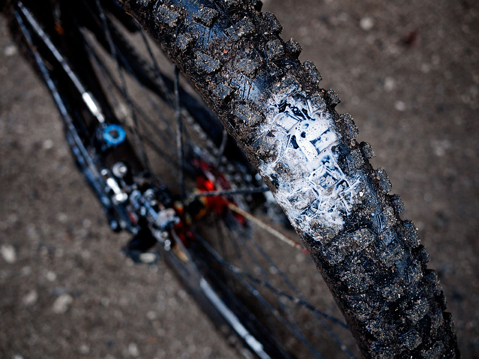 Dagen efter holder de stadig luft, så jeg triller glad i skoven. Umiddelbart kan jeg ikke mærke forskel på flydende hvid, og fast grøn, latex. Heller ikke på det stivfrosne spor, der er ujævnt som en dyreveksel i Alperne. Raketdækkene er fede, også her .. indtil de pludselig begynder at sejle rundt på sporet. Da jeg ikke længere selv kan bestemme i hvilken retning jeg vil, er jeg klar over der er noget galt. Der mangler ca 20 psi i hvert dæk, der er 10 tilbage .. og det er for lidt. Mælkeskægget langs fælgkanten afslører at det nok ikke er selve dækket der er utæt. Tre gentagelser af seancen og en senere konversation med internettet sandsynligør at Mavic TN719 fælge ikke kan gøres tubeless udelukkende med Yellow-tape, men kræver en rimstrip. Og der går min gummigrænse!
