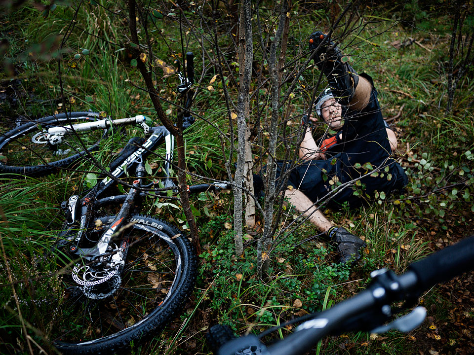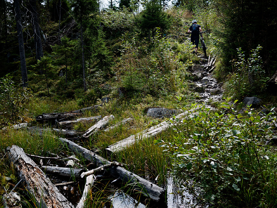 Med Thomas forrest fik vi hurtigt at se, at stierne kan køres og at selvom vi slet ikke kunne være med, hjalp det rigtig meget at køre i hans spor. Nu kørte vi måske godt trefjerdedele af tiden og oplevelsen var en helt anden. Men stadig, slet ikke hvad vi normalt kalder singletrack, heller ikke et teknisk singletrack, snarere et enduro-track. Udfordringer til grænsen hele tiden, og aldrig en pause eller et stykke med flow. Thomas var i sit es og kørte som en bjergged, og vi andre accepterede at der er forskel på hvad man kalder singletrack på norsk og på dansk.