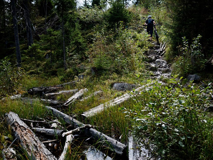 Smart at kunne cykle ombord på færgen, ingen cykelkuffert eller fly, og videre til vandrehjemmet næste morgen .. på cykel, og næsten udhvilede. Bagagen blev stillet og GPS’en tændt, 3-4 km til sporet. Det gik hurtigt op for at sommeren heller ikke har været helt tør i Oslo. Vandrestierne i Nordmarka er små snørklede stier med masser af rødder, klipper og vandhuller og de går stejlt op og ned .. og så er der svaberg! Svaberg betyder meget glat klippe og er i praksis en mellemting mellem is og brun sæbe .. fåck, det er glat. Det korte af det lange er at vi gik lige så meget som vi cyklede, og at vi måtte korte ruten ned til godt halvdelen og endda ty til ekstra grusvej, for at nå hjem.