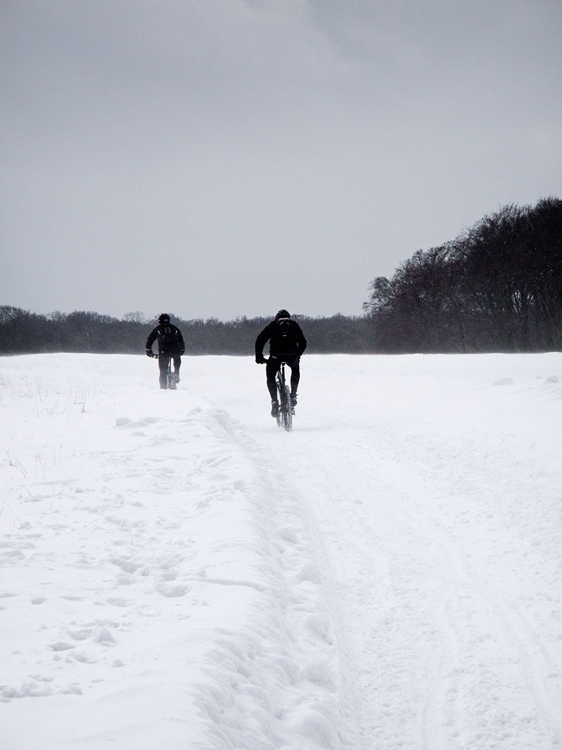 Med mindre du er ejer af et par langrendski, er der ingen grund til at opgive cyklingen på grund af sneen. I dag var det som at køre på nybagt sprød marengs ! Fed træning på alle måder. De dejlige singletracks, som vi normalt kører, er ikke farbare på andet end ski lige nu. Men de større stier, som vi normalt undgår, er helt ideelle. De er trampet flade i små stier, som kræver det hele. Balance for ikke at ryge ud i den nybagte marengs, tempo for ikke at sidde fast og udelt opmærksomhed pga den inkonsistente overflade. Og så niver det dejligt i lårbasserne.